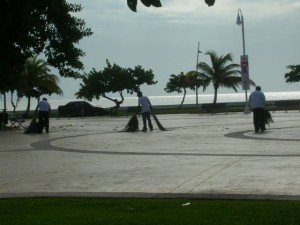 Number 5 is just a piece of fabric like a common 8′ x 8′ burlap landscape tote that can be used with a whisking action to clean a sidewalk.