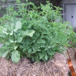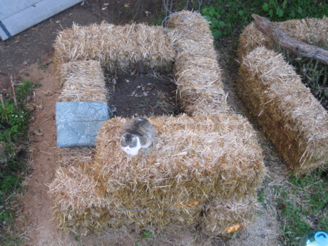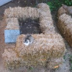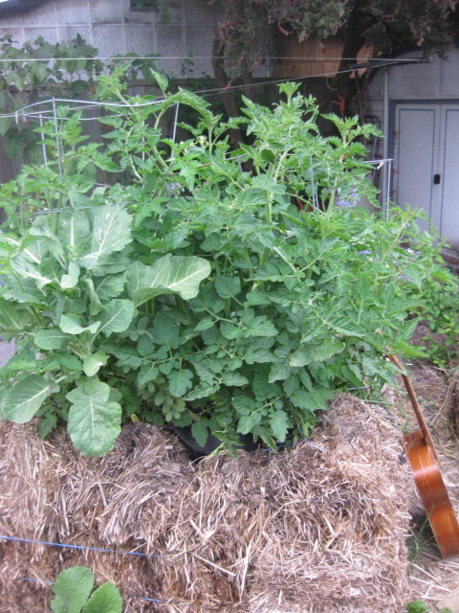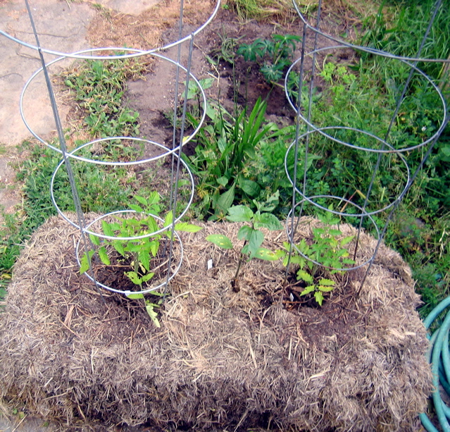 Straw bales are inexpensive and if you are resourceful even free.  Tomato starts can be planted right in the bale just by replacing a handful of straw with a pocketful of soil. As the photo shows, straw bales can be configured as raised garden beds, filled with soil and planted. Of course the bales will only last for a season and then become compost. A short-term, cheap, non-toxic and fun way to build a temporary garden bed and soil at the same time.