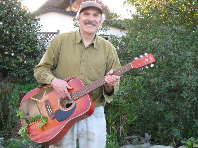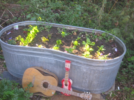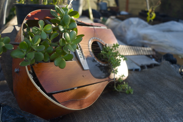 Of course I have inserted into the table many of the conventional building materials used for raised garden beds. Here they are with a description of their merits. In another instance someone had a “Jimi Hendrix moment” with their guitar and threw away the smashed instrument. I pulled it out of the trash, put soil in it and planted it with succulents. People are delighted when they see it, especially when they hear the story behind it. As you can see I cast a wide net in the search for building materials for the garden. While I’m on the subject…I’ve been on the lookout for a tuba that maybe was run over by a school bus. I want that tuba for a planter and I am going to call it garden art.