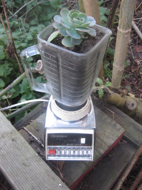 For instance, my old food blender recently gave up the ghost. Instead of just tossing it in the trash I filled the blender “container” with soil and planted it with succulents.