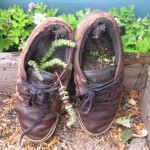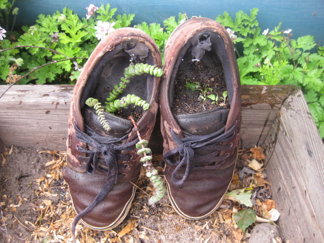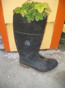 2) + B)  Old boots and Old shoes, These bootswere made for walking…but now they’re retired and growing strawberries. Good thing there is a hole at the bottom for drainage.