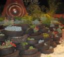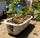 1) + C) Horse trough, reclaimed metal, old toilets, old bathtubs, urbanite, brick, stone
