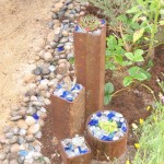 1) + B) Old tea pot, old saxophone, old tuba, wine bottles, wine barrels, driftwood, logs, salvaged lumber, redwood. The teapot, saxophone and tuba used as planters are all examples of playful, whimsical garden art. Metal, ceramic or porcelain items will all be long lasting, non-toxic plant containers, (Hint: dril a hole at the bottom for drainage.) Wine bottles planted upside-down and side-by-side can make an attractive garden border. An up cycled creative re-invention of a common household item. Wine barrels have been used as planting containers ever since vintners started casting them off. They last up to 10 years and are pleasing to look at, brimming with herbs or flowers.